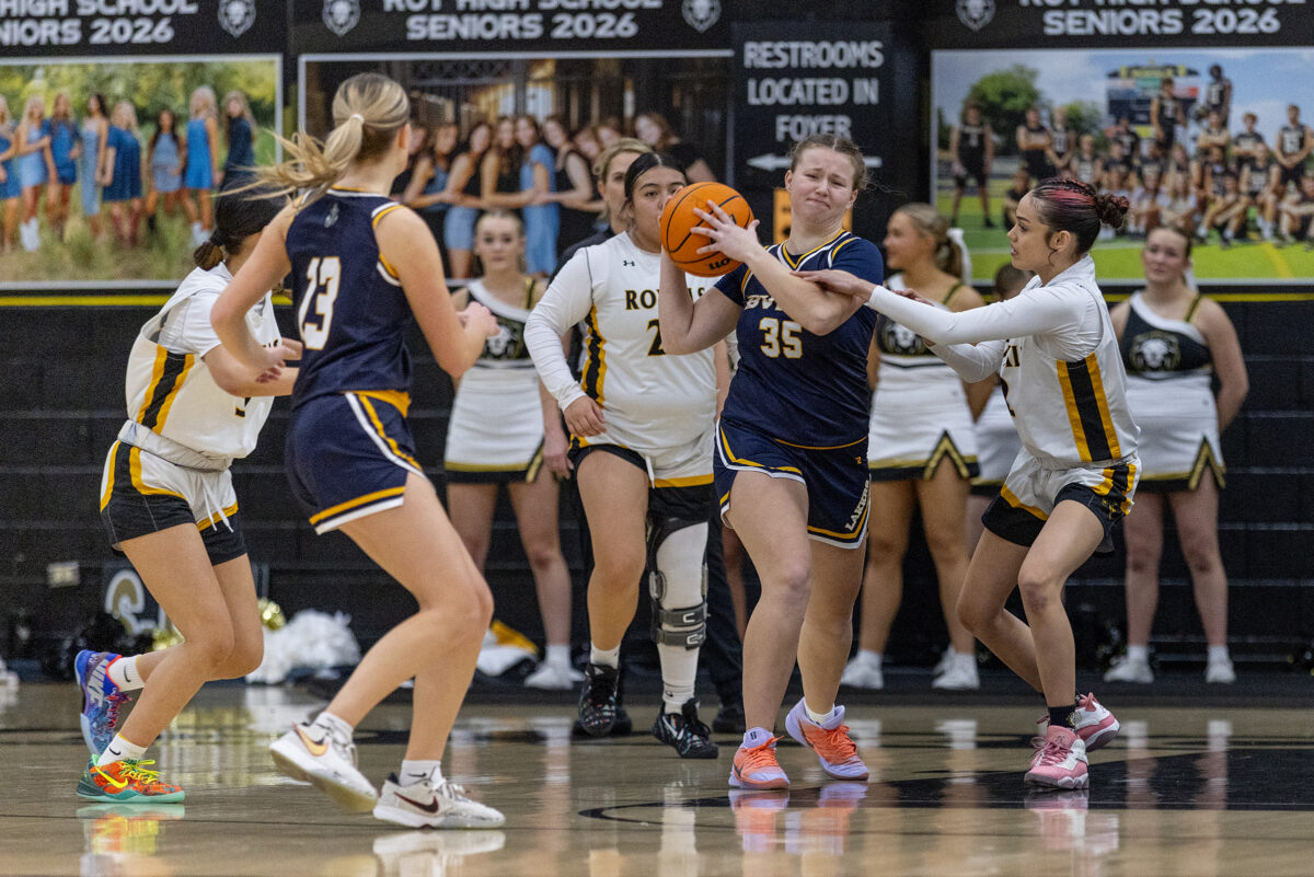 - Bonneville High’s Madilynn Degroot (35) battles to keep the ball against Roy’s Holly Burnett, right, on Wednesday, Jan. 7, 2026, in Roy.