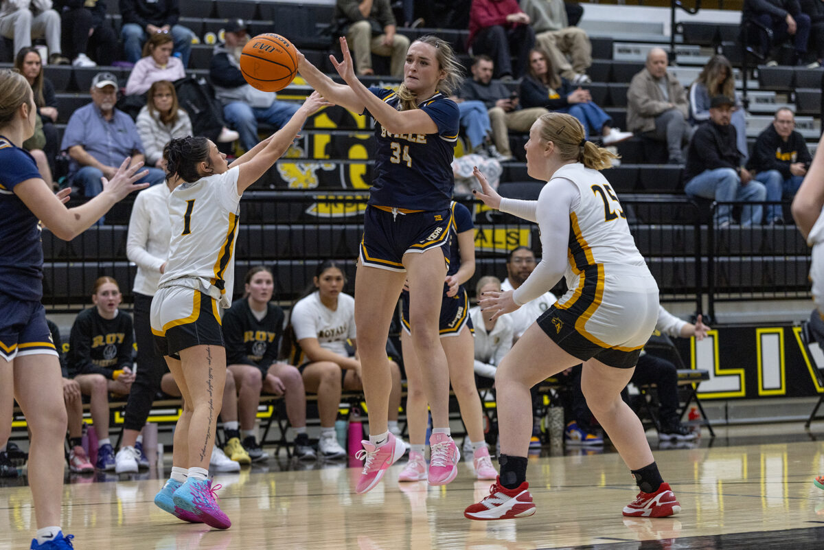 - Bonneville High’s Adisyn Stone (34) passes the ball past Roy’s Lily Perez (1) and Quincy Hoover (25) on Wednesday, Jan. 7, 2026, in Roy.