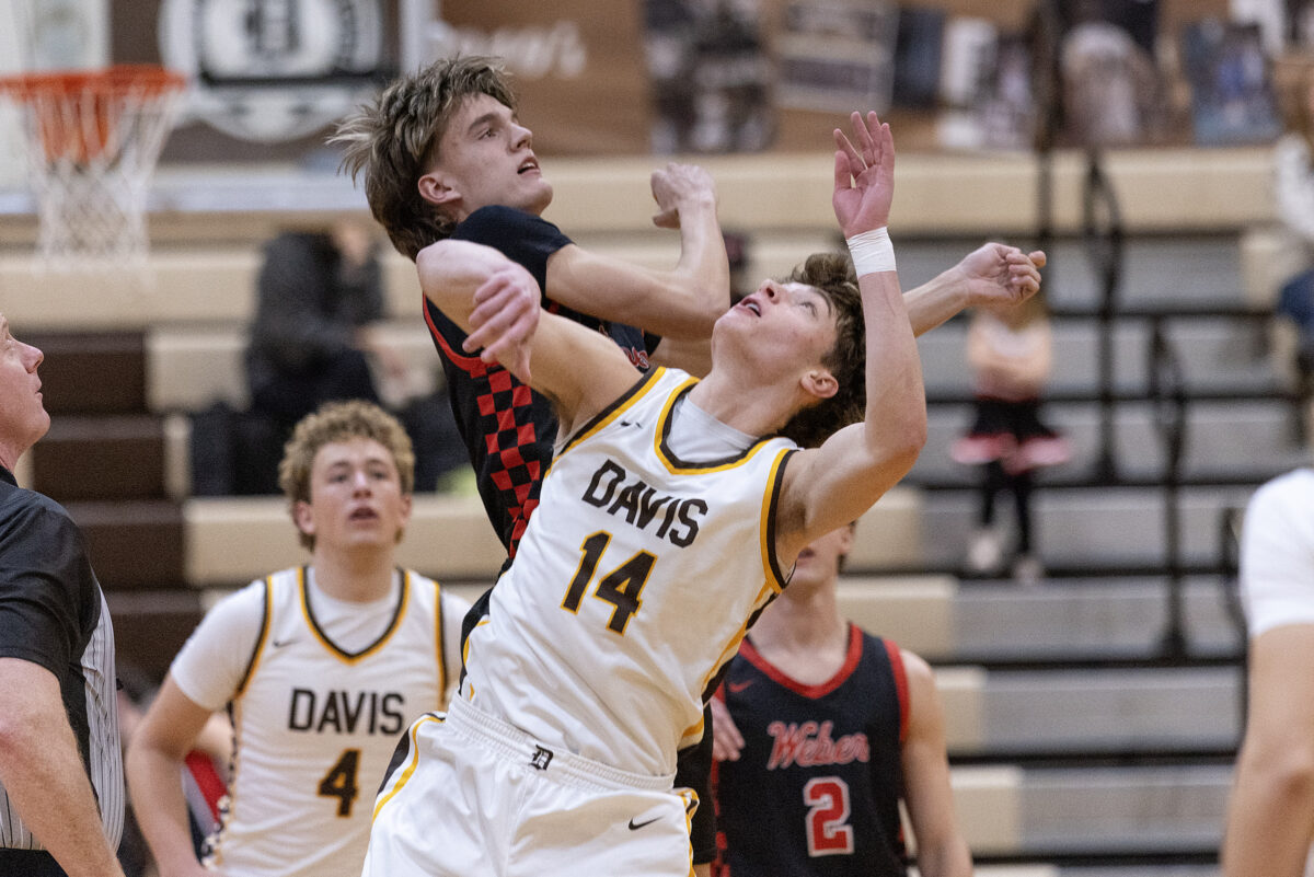 - Weber High’s Creed Devries, top left, battles for the ball with Davis High’s Cameron Brower (14) in a Region 1 boys basketball game Friday, Jan. 9, 2026, in Kaysville.
