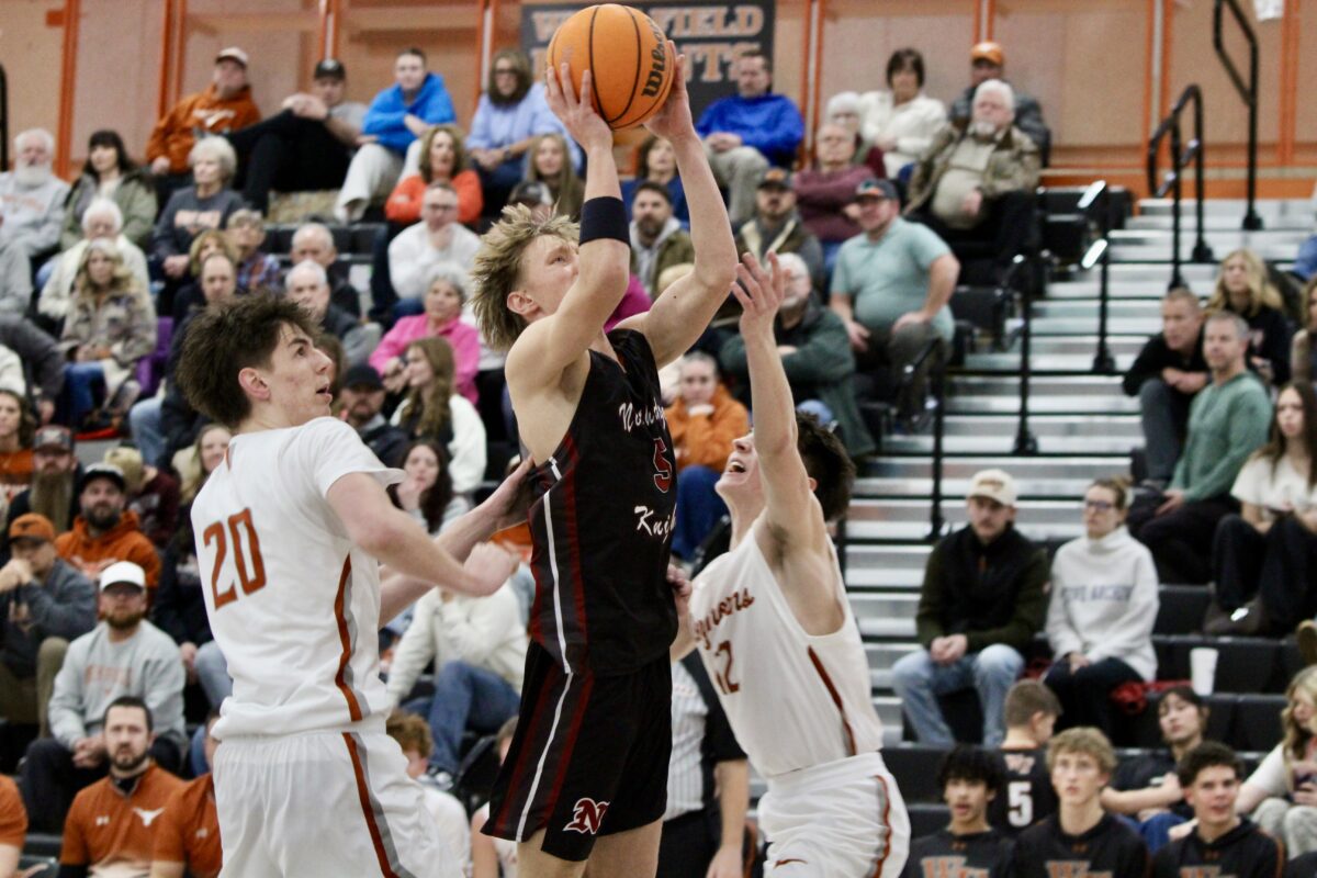 - West Field’s Cason Malan, defended by Northridge’s Jace Whitear, left, watches a long try sail toward the basket during a region boys basketball contest on Friday, Jan. 30, 2026, at West Field High School in Taylor.