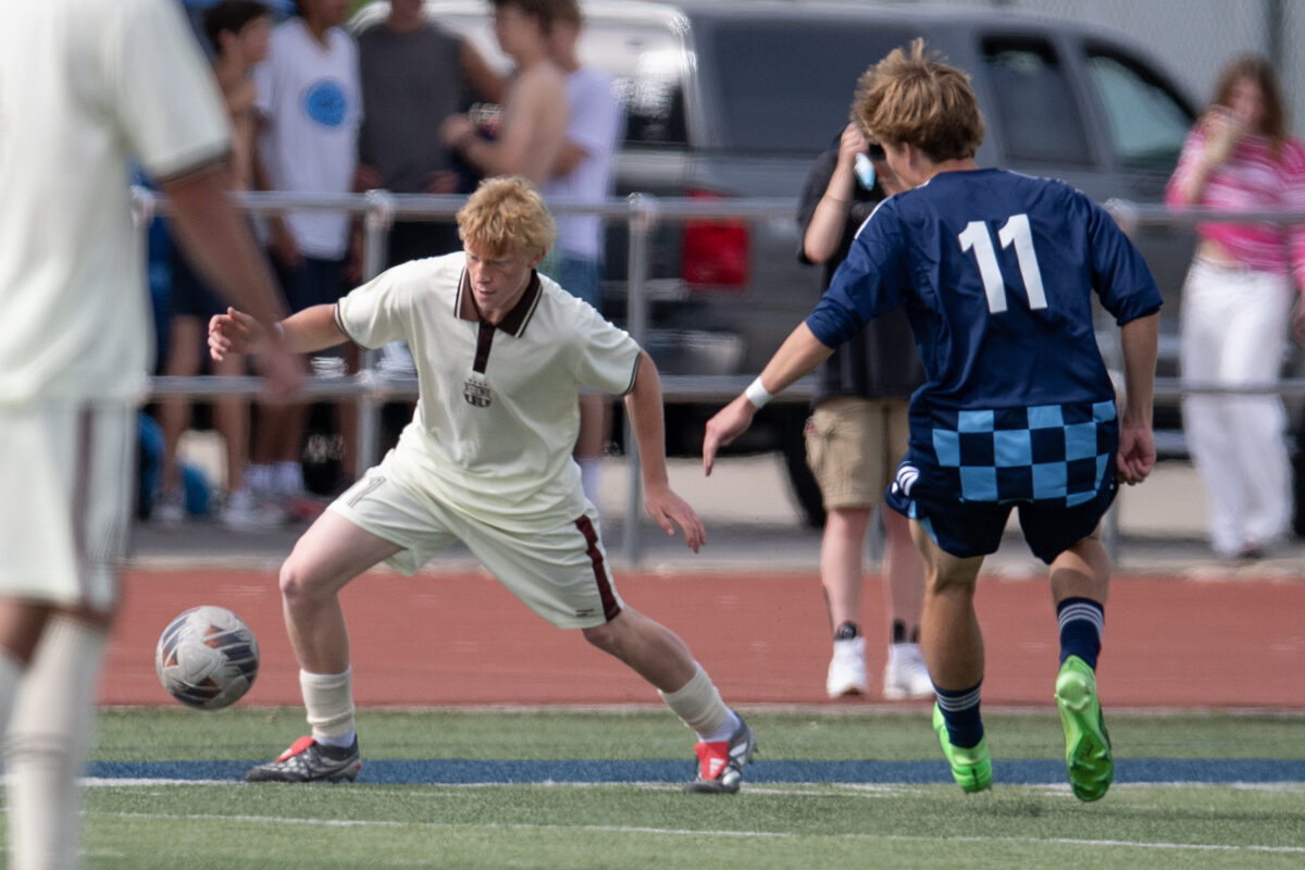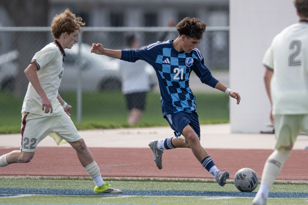 - Layton High’s Wylee Rollins (21) moves the ball past Davis High’s Griffin Carmack (22) during a Region 1 boys soccer match Friday, March 27, 2026, in Layton.