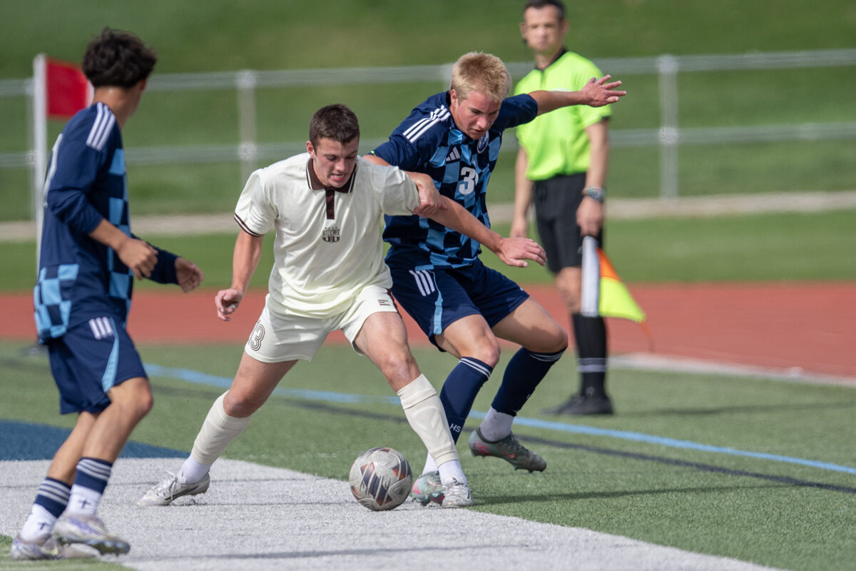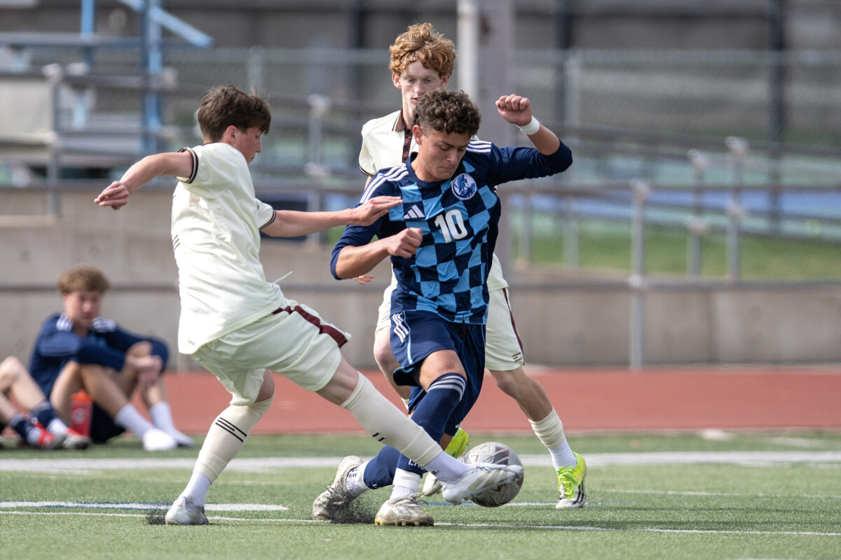 - Davis High’s Calvin Huff, center, battles Layton’s Joseph Rudolphi, right, during a Region 1 boys soccer match Friday, March 27, 2026, in Layton.