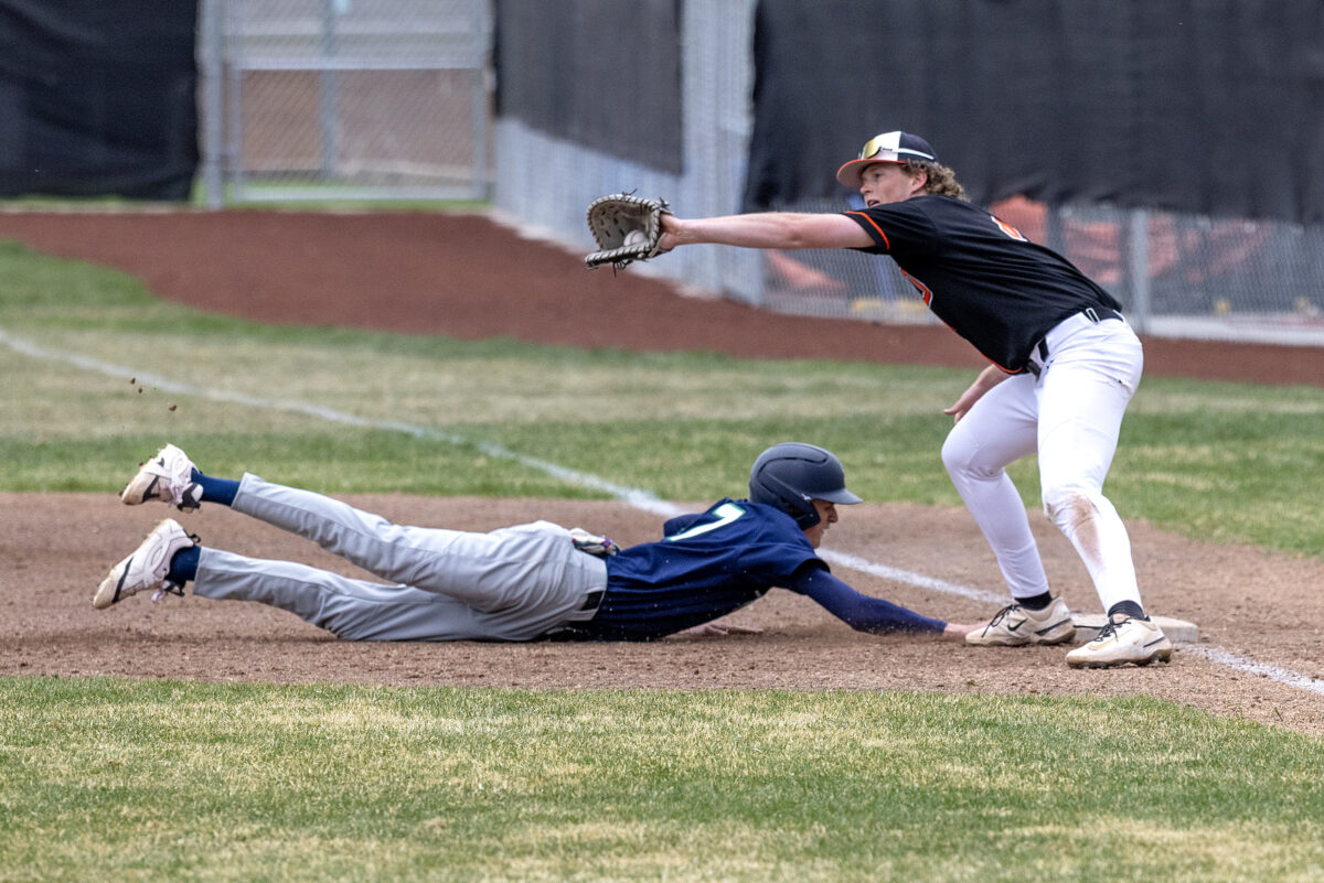 - Ogden High’s Carson Cowles, right, reaches for an attempted pickoff throw as Syracuse’s Crosby Albright dives back into the bag during a prep baseball game Tuesday, March 31, 2026, in Ogden.