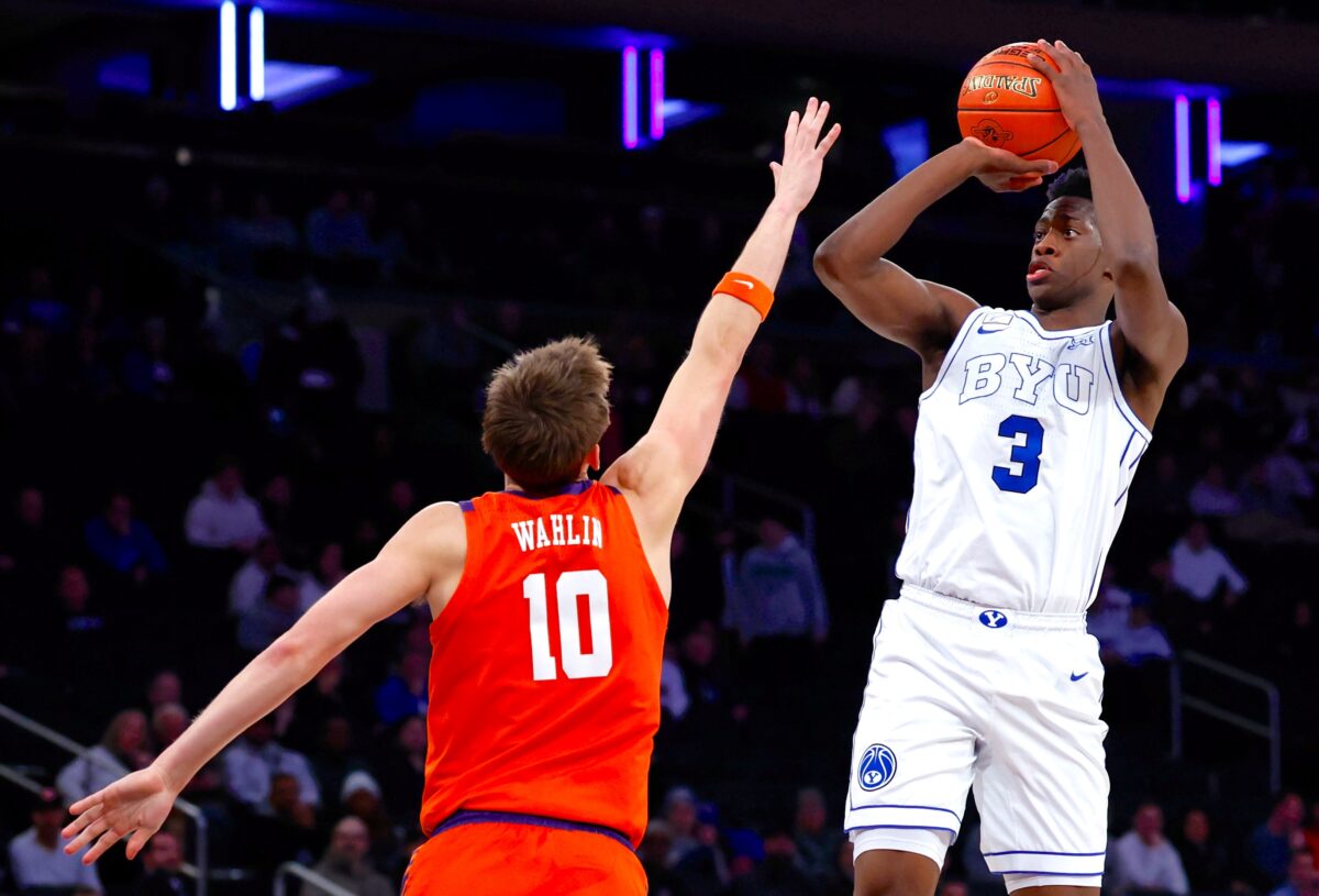 - BYU forward AJ Dybantsa (3) shoots over Clemson forward Jake Wahlin (10) during the first half of an NCAA college basketball game, Tuesday, Dec. 9, 2025, in New York. (AP Photo/Noah K. Murray)