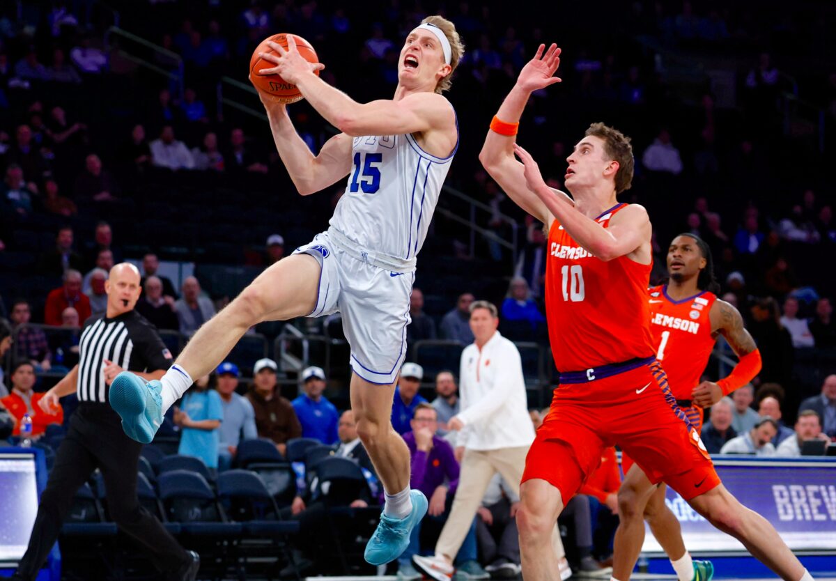 - BYU guard Richie Saunders (15) drives to the basket against Clemson forward Jake Wahlin (10) during the first half of an NCAA college basketball game, Tuesday, Dec. 9, 2025, in New York. (AP Photo/Noah K. Murray)