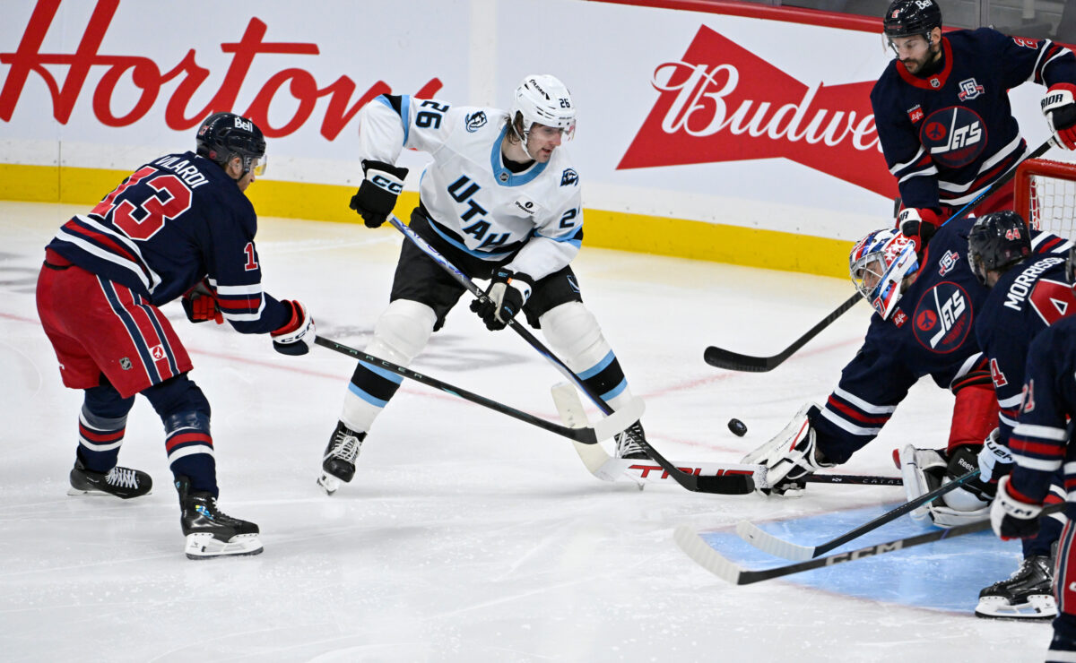 - Winnipeg goaltender Connor Hellebuyck, center right, makes a save against Utah’s Dmitri Simashev (26) on Sunday, Oct. 26, 2025, in Winnipeg, Manitoba.
