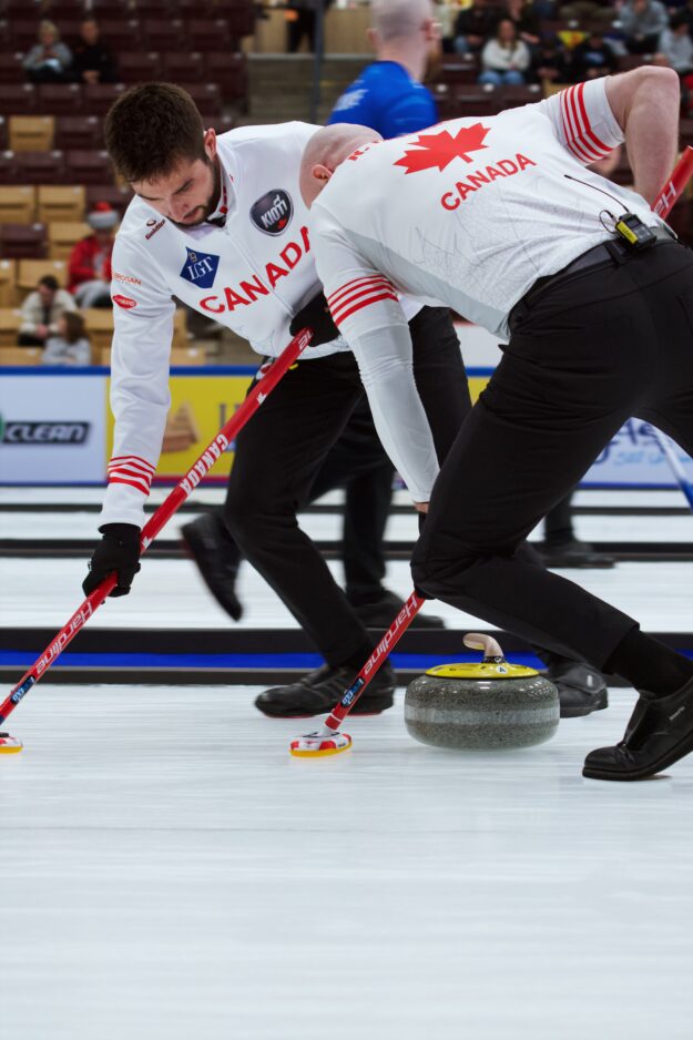 - Canada’s E.J. Harnden, left, and Colton Lott, right, sweep the curling stone during a game against Czechia at the 2026 World Men’s Curling Championship at the Weber County Ice Sheet in Ogden on Wednesday, April 1, 2026.