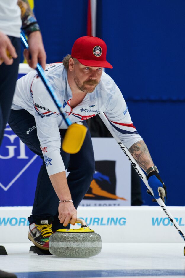 - The United States’ Matt Hamilton prepares to deliver the curling stone during a game against Switzerland at the 2026 World Men’s Curling Championship at the Weber County Ice Sheet in Ogden on Thursday, April 2, 2026.