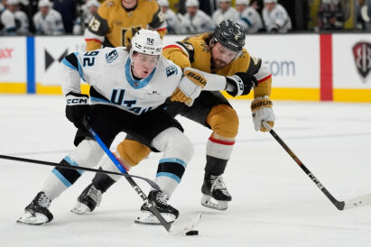 Utah Mammoth center Logan Cooley (92) skates around Vegas Golden Knights defenseman Rasmus Andersson, right, during the first period of an NHL hockey game March 19, 2026, in Las Vegas.The Utah Mammoth rebuild took only the second season in the Beehive State to reach the playoffs and the No. 1 wild-card team in the Western Conference has the schedule for its first-round series against the Vegas Golden Knights.