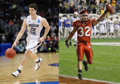 - LEFT: BYU guard Jimmer Fredette dribbles during an NCAA tournament game on March 17, 2011, in Denver. RIGHT: Utah’s Eric Weddle scores a touchdown in the Armed Forces Bowl on Dec. 23, 2006, in Fort Worth, Texas.