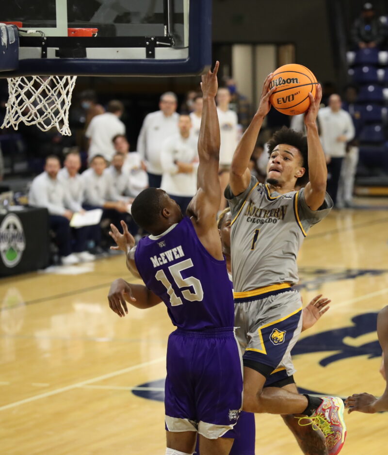 - Northern Colorado’s Daylen Kountz (1) drives against the defense of Weber State’s Koby McEwen (15) on Thursday, Jan. 27, 2022, in Greeley, Colo.