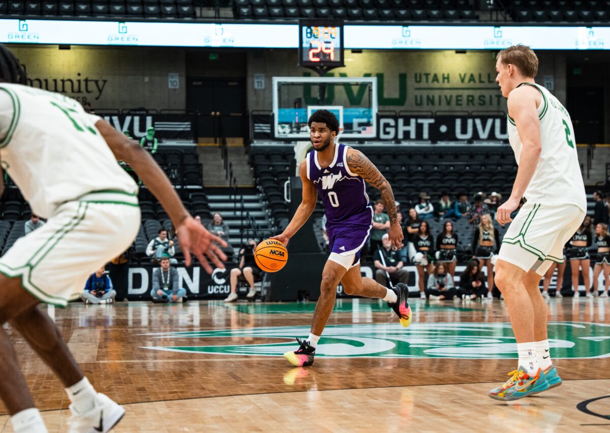 - Weber State forward Edwin Suarez Jr. (0) moves the ball against Utah Valley on Wednesday, Dec. 17, 2025, at the UCCU Center in Orem.