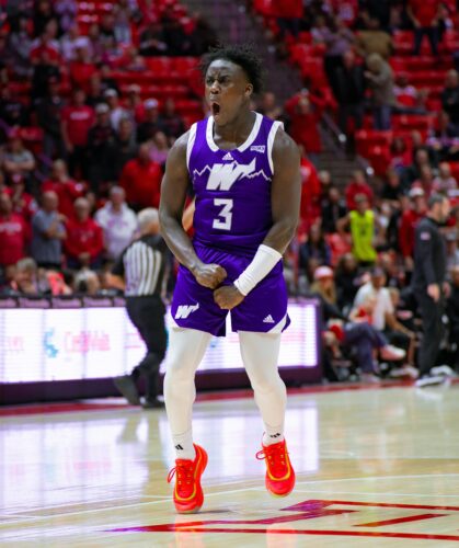Weber State guard Tijan Saine Jr. reacts after making a 3-pointer against Utah on Saturday, Nov. 8, 2025, at the Huntsman Center in Salt Lake City.The Weber State men’s basketball team brought a new alternate uniform on board this season.