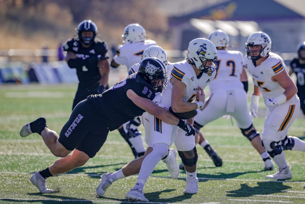 - Weber State defensive tackle Matt Herron (97) sacks Northern Arizona quarterback Ty Pennington in a game Saturday, Nov. 22, 2025, at Stewart Stadium in Ogden.