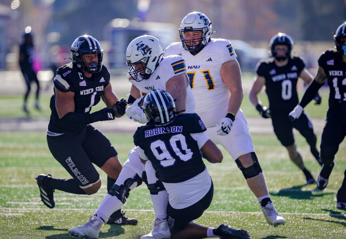 - Weber State defensive linemen Chevy Robinson (90) and Keahnist Thompson (1) bring down Northern Arizona’s Seth Cromwell in a game Saturday, Nov. 22, 2025, at Stewart Stadium in Ogden.