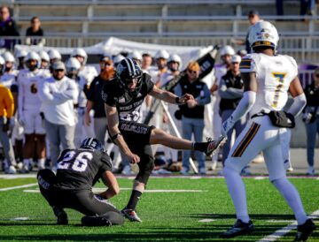 - Weber State kicker Sloan Calder, center, boots a field goal with Peyton Beck (26) holding in a game against Northern Arizona on Saturday, Nov. 22, 2025, at Stewart Stadium in Ogden.