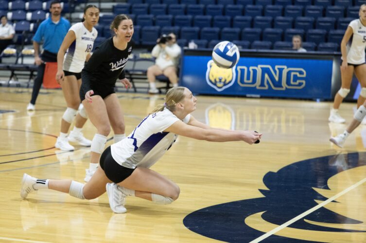 Weber State's Ashley Gneiting dives for a dig in a Big Sky tournament quarterfinal against Montana on Monday, Nov. 24, 2025, in Greeley, Colo.Weber State senior Jayda Tupea attempted to repeat a successful kill she had a few points earlier in the second set, slicing a hard angle across the net on a swing. Her ball landed long of the sideline and out for a Montana point.