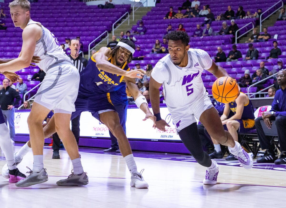 - Weber State forward Nigel Burris (5) drives round Kansas City’s Chris Dockery on Saturday, Nov. 29, 2025, at the Dee Events Center in Ogden.