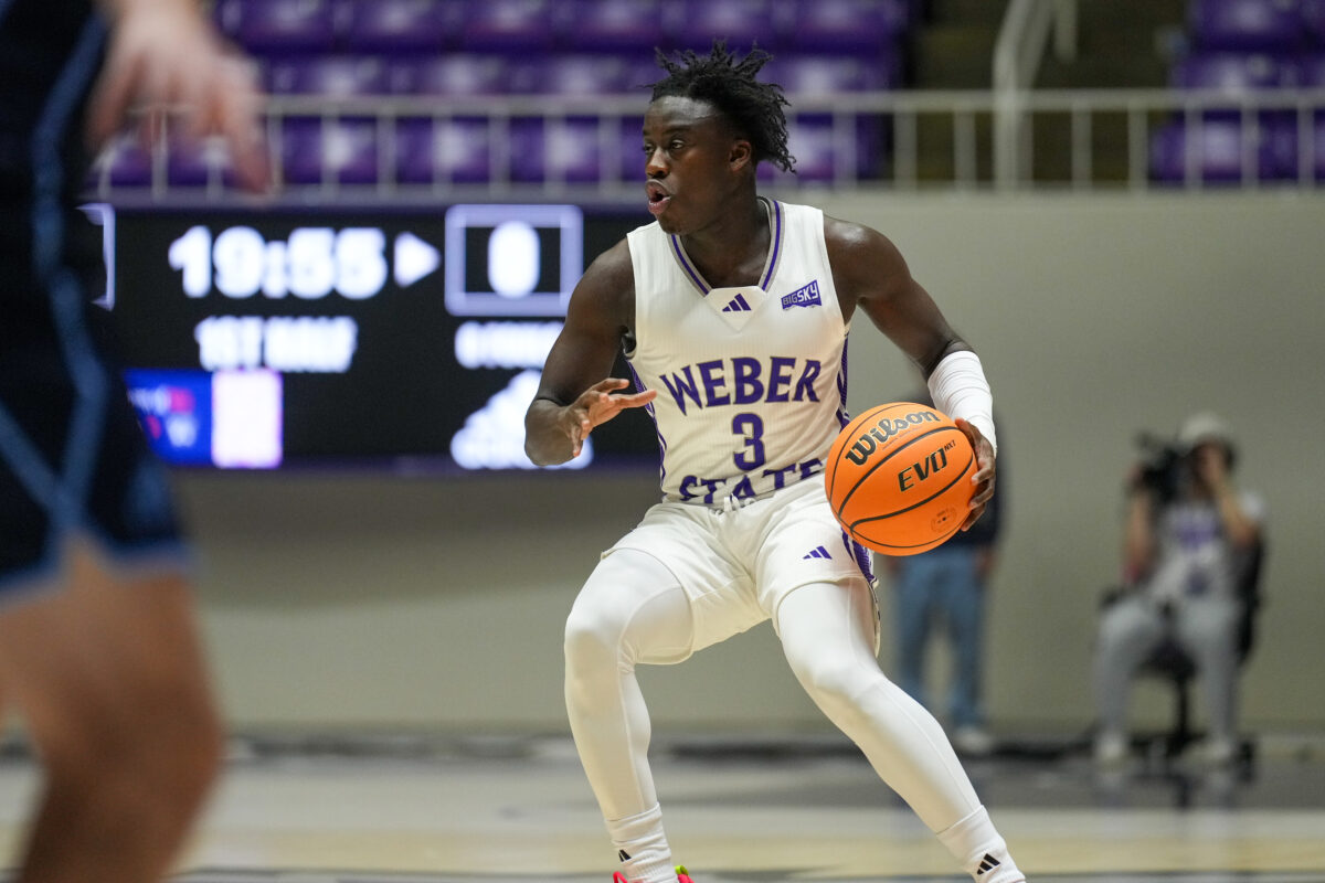 - Weber State guard Tijan Saine (3) handles the basketball in an exhibition against Colorado Christian on Wednesday, Oct. 29, 2025, at the Dee Events Center in Ogden.