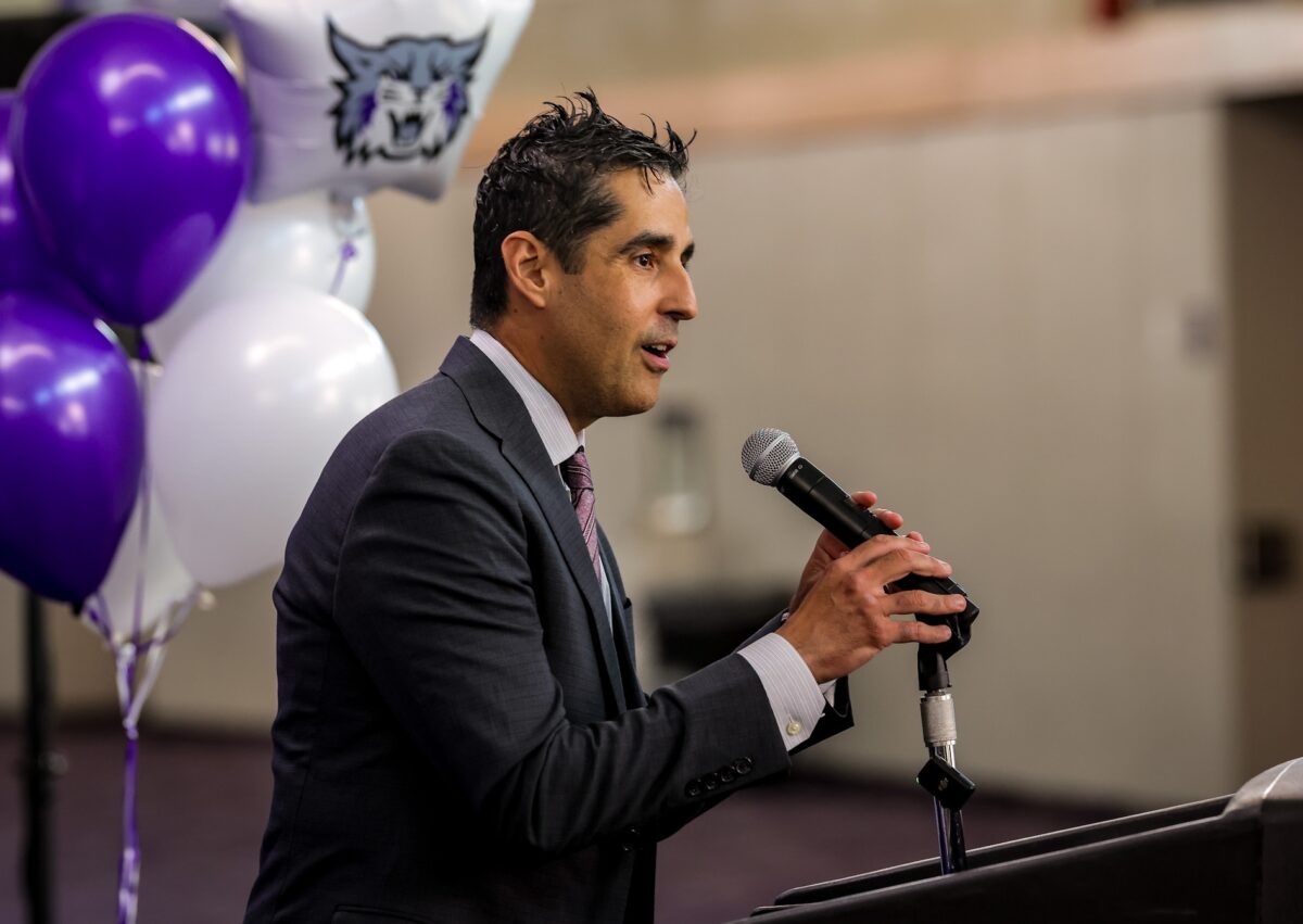 Wearing a mauve tie, a dark suit and white Adidas sneakers, the 47-year-old Texas native thanked interim president Leslie Durham, athletic director Tim Crompton, and spoke for 12 minutes in the north concourse at the Dee Events Center on Friday morning, outlining his general vision for Weber State men’s basketball as the 11th head coach in the program’s Division I history.