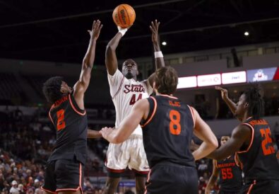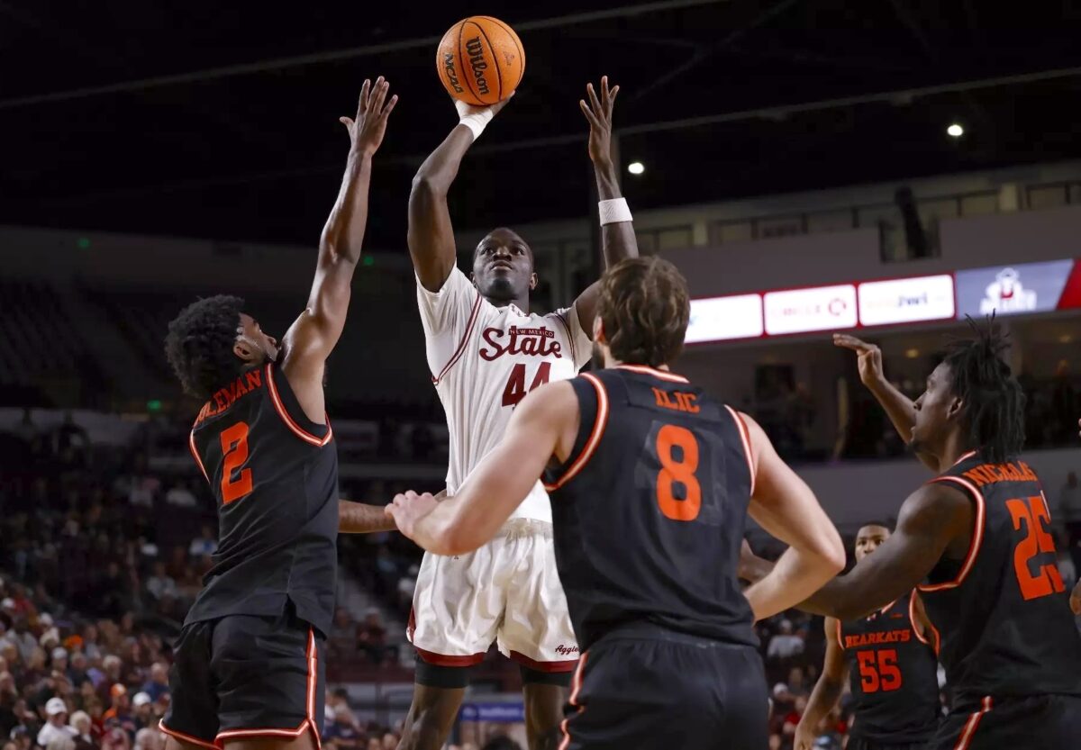 - New Mexico State center Augustine Ekwe (44) rises to shoot against Sam Houston State on Dec. 21, 2025, in Las Cruces, N.M.