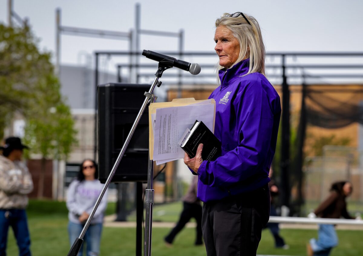 Mary Kay Amicone speaks before a game in recognition of Weber State naming its softball field after her on Saturday, April 18, 2026, in Ogden.