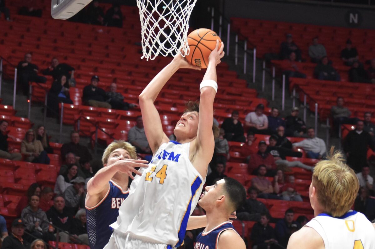 Orem's Chamberlain Burgess (24) goes up for a shot against Brighton in a 5A boys basketball quarterfinal on Feb. 25, 2025, at the Huntsman Center in Salt Lake City.