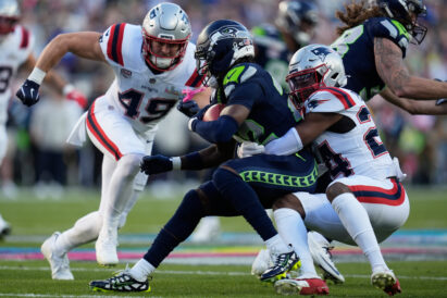 - Seattle Seahawks receiver Rashid Shaheed (22) is tackled by New England defenders during Super Bowl 60 on Sunday, Feb. 8, 2026, in Santa Clara, Calif.