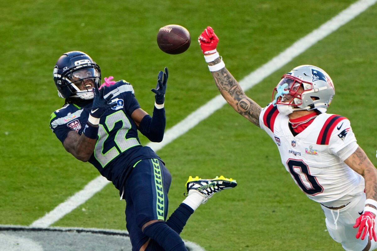- New England cornerback Christian Gonzalez (0) breaks up a pass intended for Seattle receiver Rashid Shaheed (22) during Super Bowl 60 on Sunday, Feb. 8, 2026, in Santa Clara, Calif.