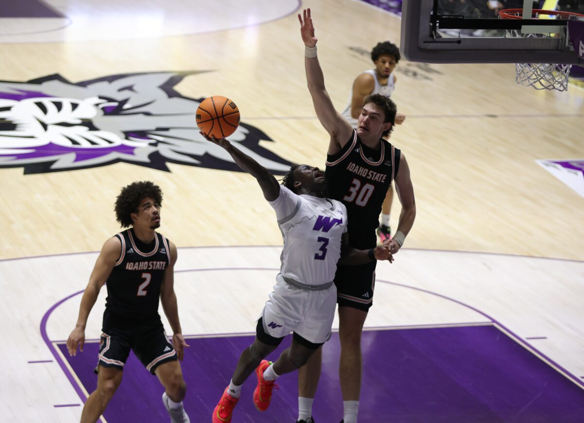 - Weber State guard Tijan Saine Jr. (3) scoops a shot past Idaho State’s Evan Otten during a Big Sky Conference game Saturday, Jan. 31, 2026, at the Dee Events Center in Ogden.