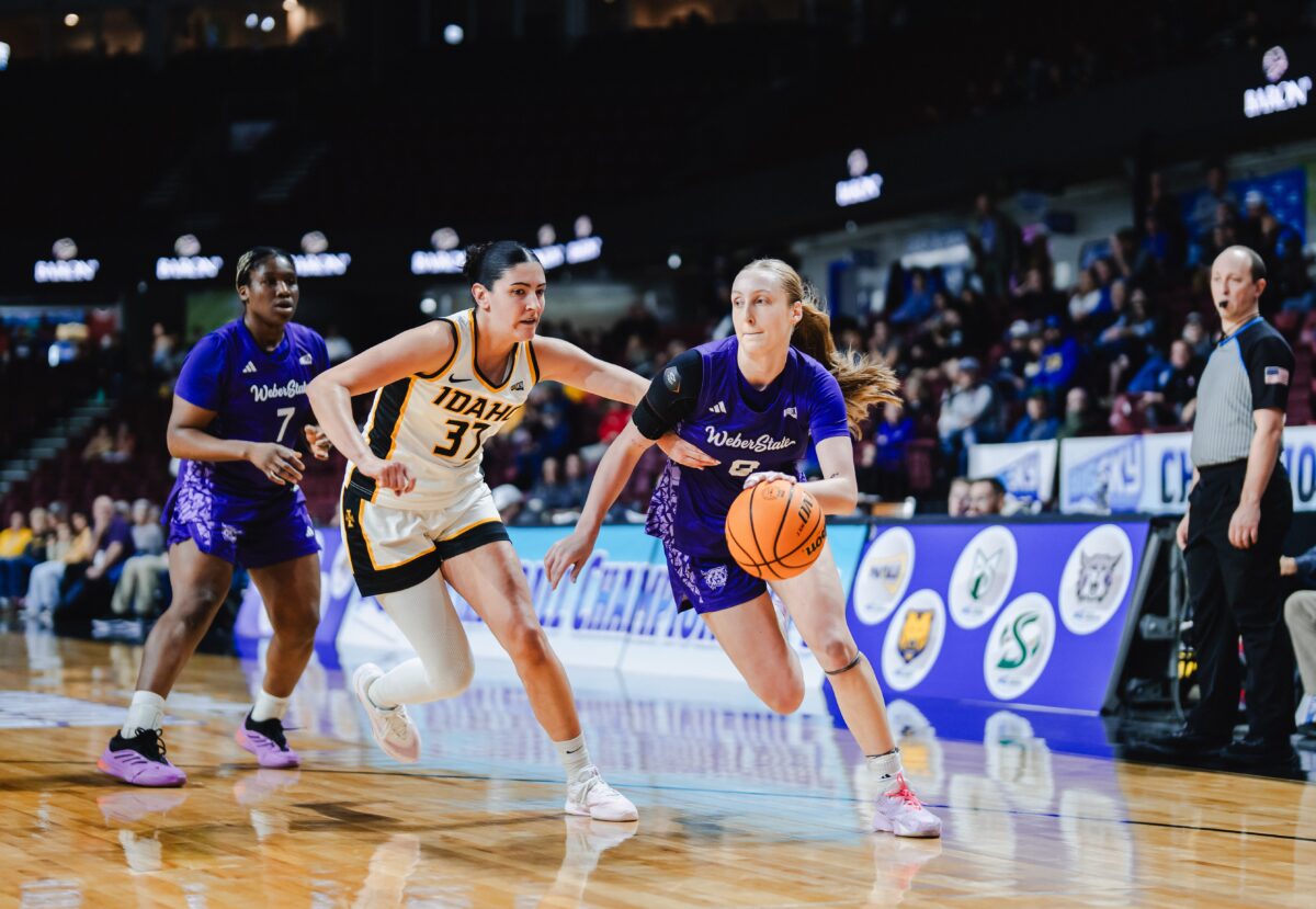 - Weber State guard Hannah Robbins, right, drives past Idaho’s Ana Pinheiro in the women’s Big Sky tournament quarterfinals Sunday, March 8, 2026, at Idaho Central Arena in Boise.