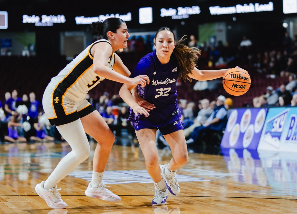 - Weber State guard Lanae Billy (32) drives against Idaho’s Ana Pinheiro in the women’s Big Sky tournament quarterfinals Sunday, March 8, 2026, at Idaho Central Arena in Boise.