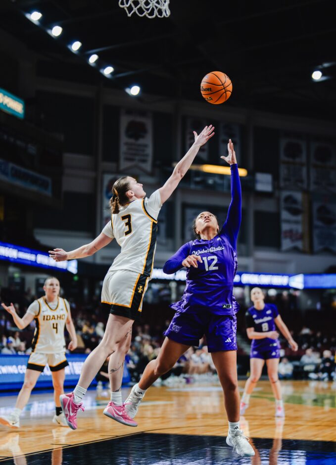 - Weber State guard Fui Niumeitolu (12) lofts a floater over Idaho’s Kyra Gardner (3) in the women’s Big Sky tournament quarterfinals Sunday, March 8, 2026, at Idaho Central Arena in Boise.