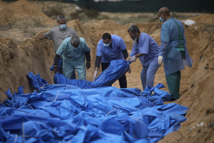 Palestinians bury people killed in the Israeli bombardment who were brought from the Shifa hospital, in a mass grave in the town of Khan Younis, southern Gaza Strip, Wednesday, Nov. 22, 2023. (AP Photo/Mohammed Dahman)