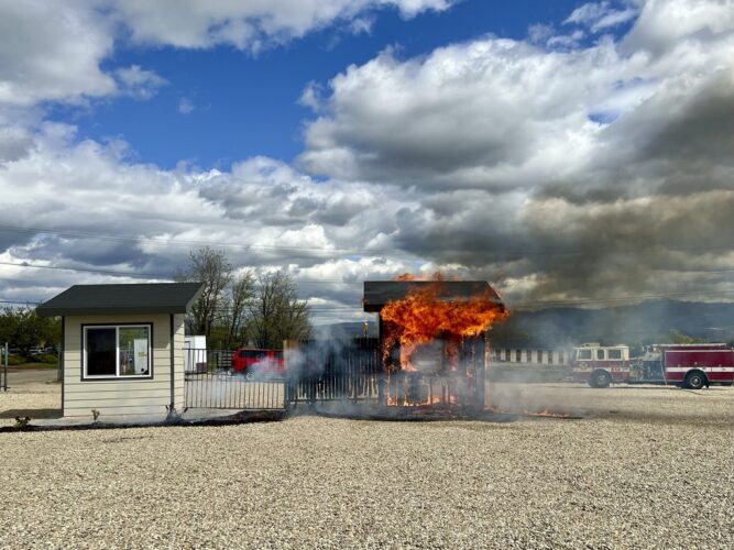 A building constructed using traditional materials and landscaping is engulfed by flames during a burn demonstration at the National Interagency Fire Center in Boise, Idaho, Monday, April 29, 2024. The building on the right was also exposed to flames during the demonstration, but it was built using fire-resistant materials and was mostly protected from damage. (AP Photo/Rebecca Boone)