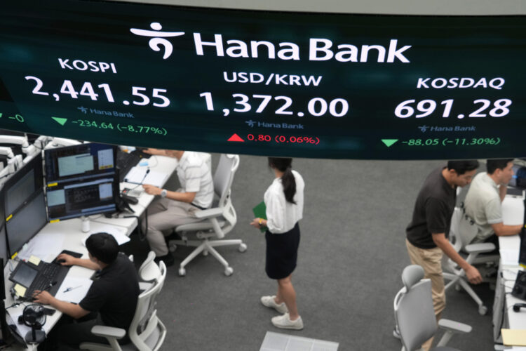 Currency traders work near a screen showing the Korea Composite Stock Price Index (KOSPI), top center left, and the foreign exchange rate between U.S. dollar and South Korean won, top center, at the foreign exchange dealing room of the KEB Hana Bank headquarters in Seoul, South Korea, Monday, Aug. 5, 2024. (AP Photo/Ahn Young-joon)