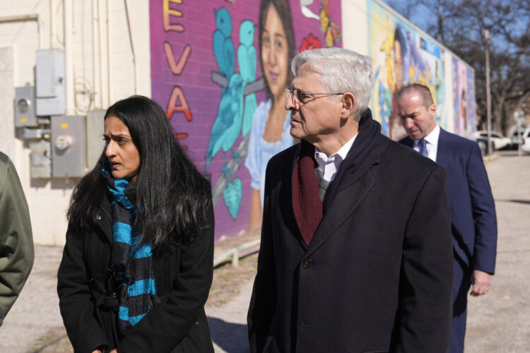 Attorney General Merrick Garland, right, and Associate Attorney General Vanita Gupta, left,tour of murals of shooting victims, Wednesday, Jan. 17, 2024, in Uvalde, Texas. The Justice Department is planning this week to release findings of an investigation into the 2022 school shooting. (AP Photo/Eric Gay)