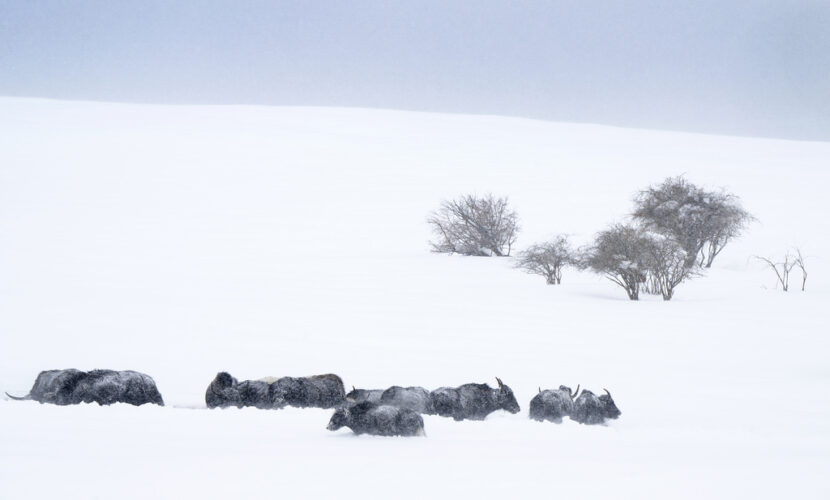 Livestock huddle in the deep snow outside Divide, Colo., as the snow and wind continue Thursday, March 14, 2024. A major storm is dumping heavy, wet snow in Colorado — forcing flight cancellations and shutting down a highway that connects Denver to Colorado ski resorts. (Christian Murdock/The Gazette via AP)