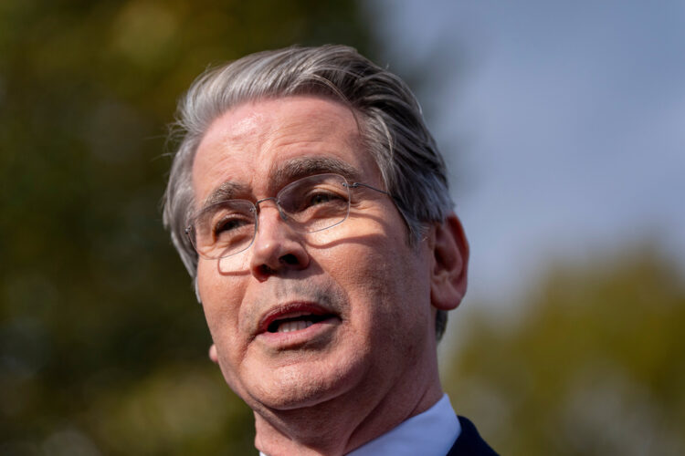 Treasury Secretary Scott Bessent speaks with reporters at the White House, Wednesday, Oct. 22, 2025, in Washington. (AP Photo/Alex Brandon)