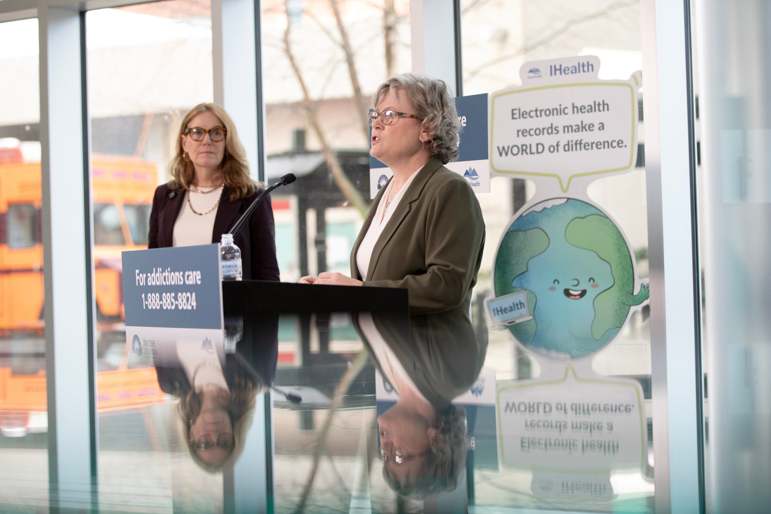 British Columbia Health Minister Josie Osborne speaks about the end of the province's three-year experiment in decriminalizing possession of small amounts of drugs as Minister for Citizens' Services Diana Gibson looks on at the Royal Jubilee Hospital in Victoria, British Columbia, Wednesday, Jan. 14, 2026. (Chad Hipolito/The Canadian Press via AP)